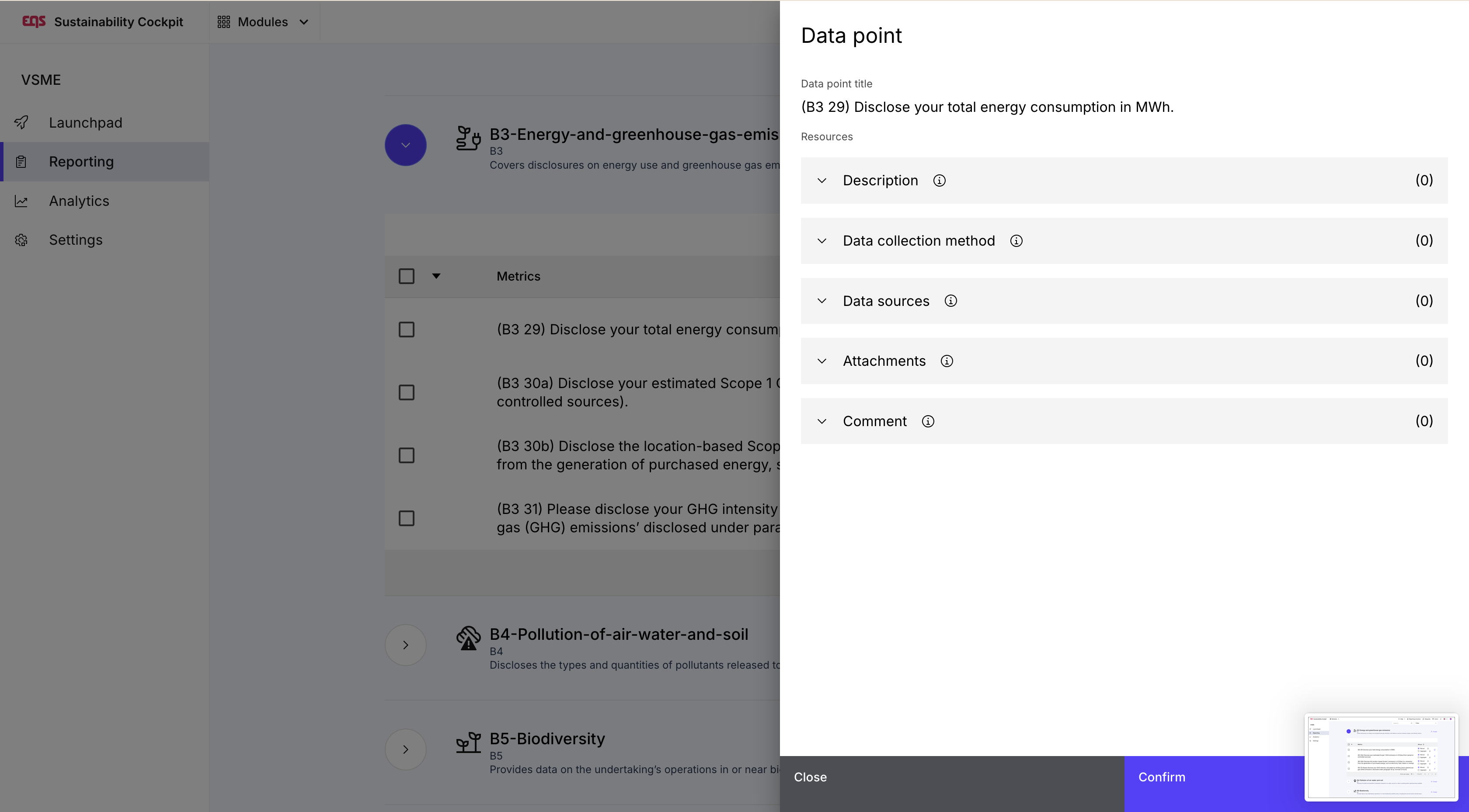 A VSME-jelentés 2. lépésében minden adatpont mellett talál egy kis ceruza ikont. Erre kattintva egy oldalsáv nyílik meg, ahol több lehetőség közül választhat az adatpont előkészítéséhez: