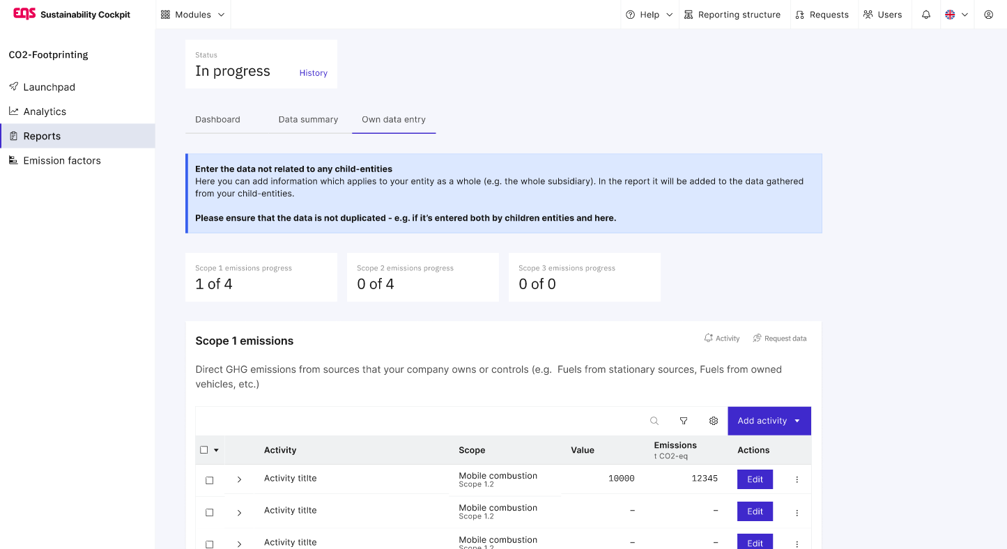 Tevékenységek szerkesztése: A tevékenységek vagy az emissziós tényezők könnyen szerkeszthetők és javíthatók közvetlenül ebben a nézetben, biztosítva a pontosságot a végső jelentés elkészítése előtt.
