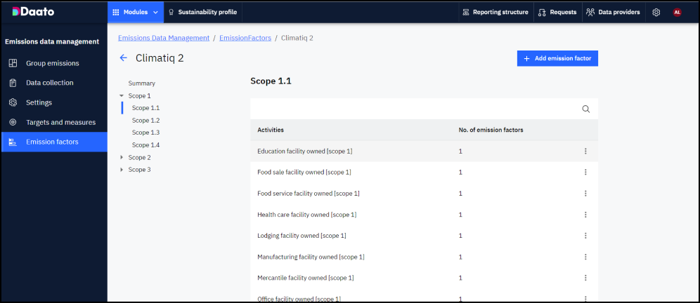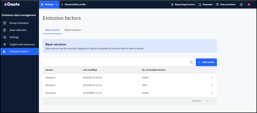 Nel menu a sinistra, clicca su “Fattori di emissione” per visualizzare l’elenco delle versioni base e delle versioni di report. Seleziona la versione su cui stai lavorando, quindi clicca sul suo nome per aprirla.
