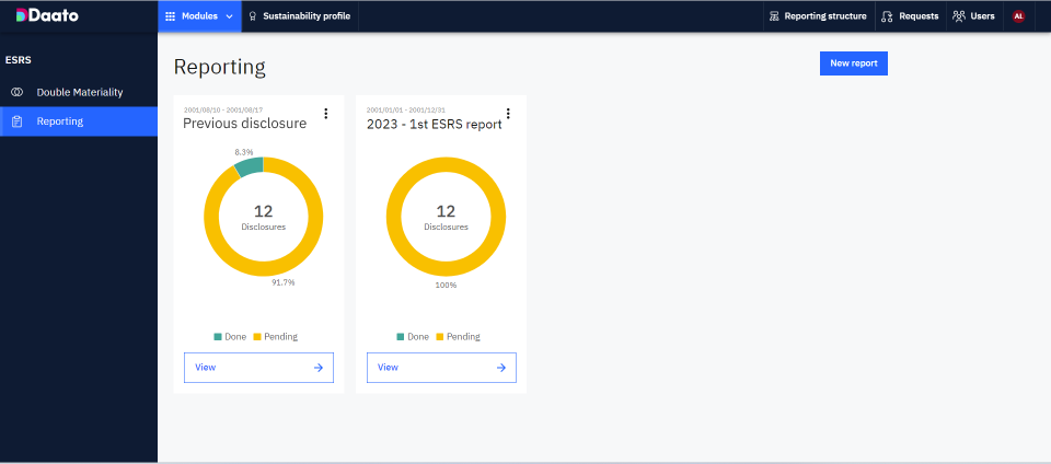 Nel tuo modulo ESRS, seleziona la scheda “Reporting” nel menu a sinistra.