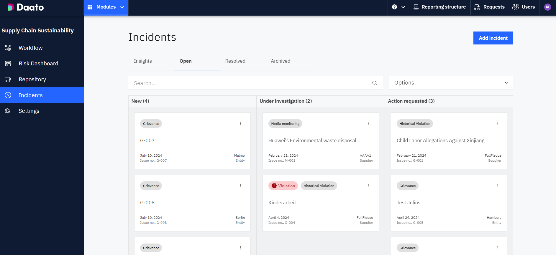 Cliccate su un incidente per aprire la scheda dettagliata.
