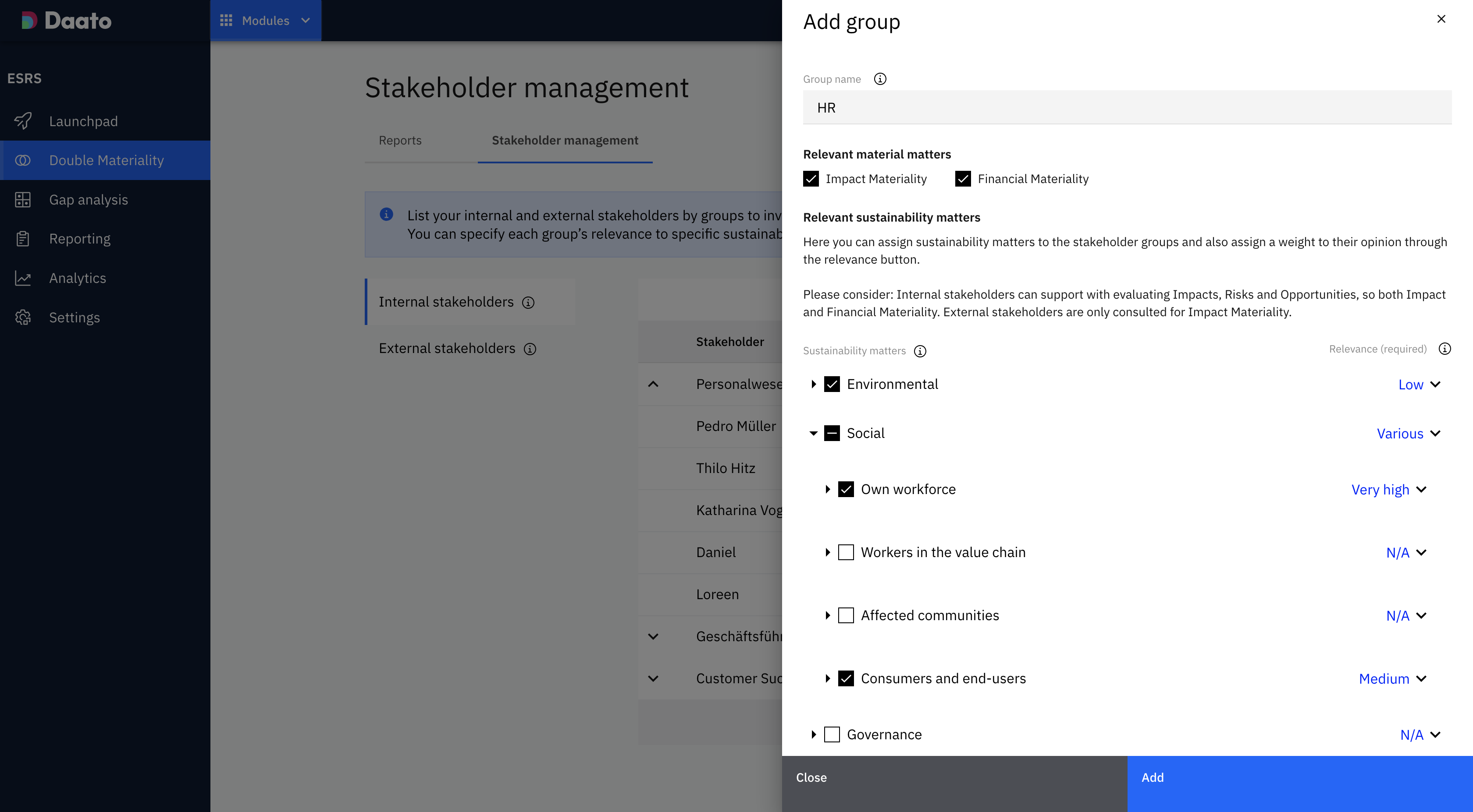 Daato offre la possibilità di archiviare nel sistema gruppi di stakeholder interni ed esterni, nonché stakeholder individuali, assegnando loro temi di sostenibilità specifici e una ponderazione corrispondente. È anche possibile documentare a quale organizzazione appartiene ciascun soggetto interessato e quale relazione ha con l’azienda. Tutti gli stakeholder registrati, singolarmente o in gruppi, possono quindi essere inclusi nei sondaggi ed essere utilizzati per valutare i temi di sostenibilità, gli impatti, i rischi e le opportunità.