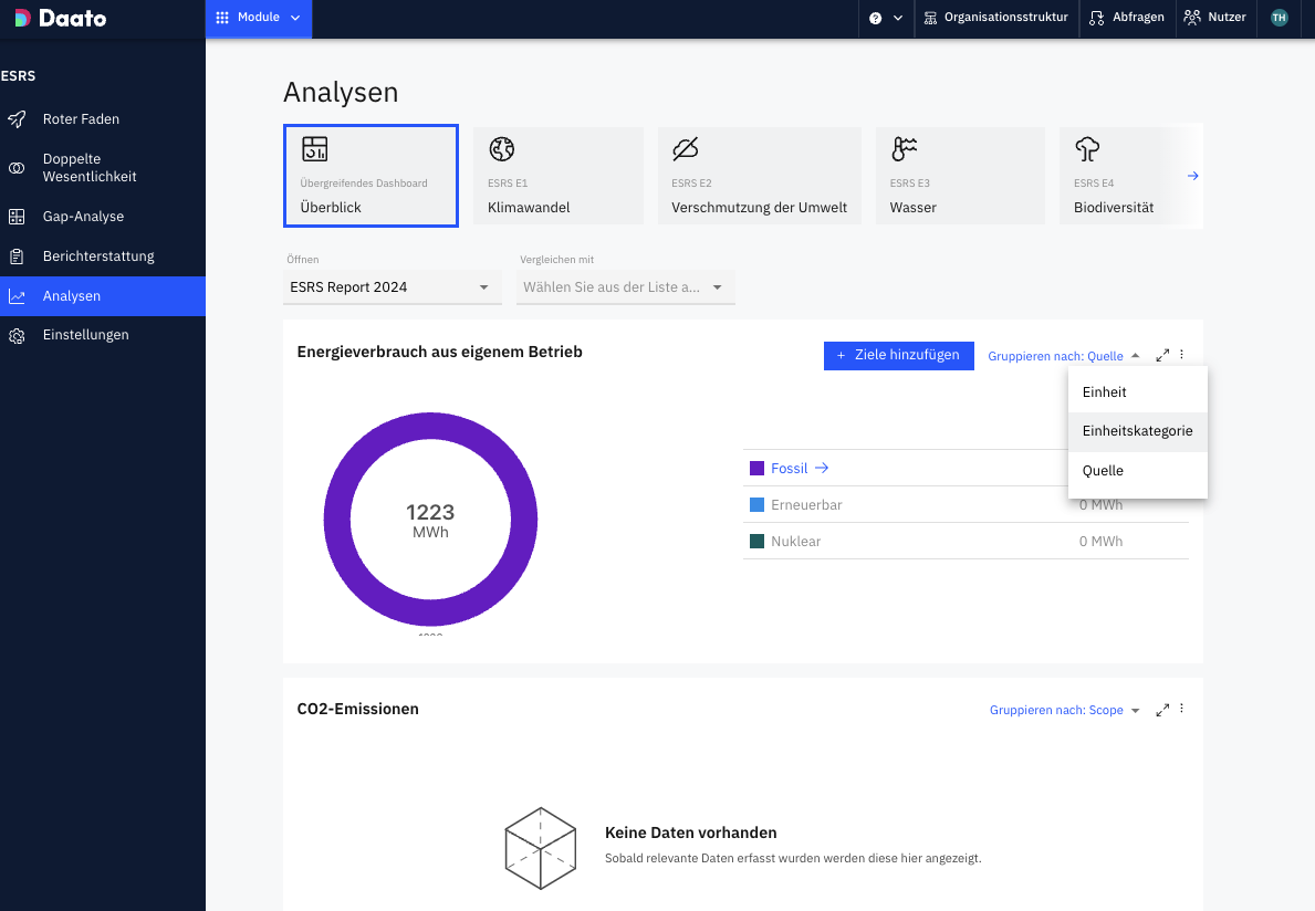 Per avere una panoramica delle vostre performance sui KPI ESRS più rilevanti, utilizzate il cruscotto nel menu “Analisi”.