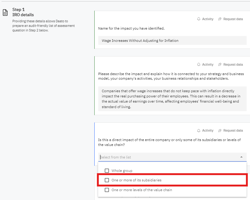Modifica il campo “Ambito dell’impatto” nel form di valutazione IRO per registrare questa informazione.