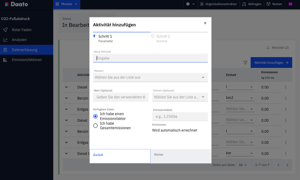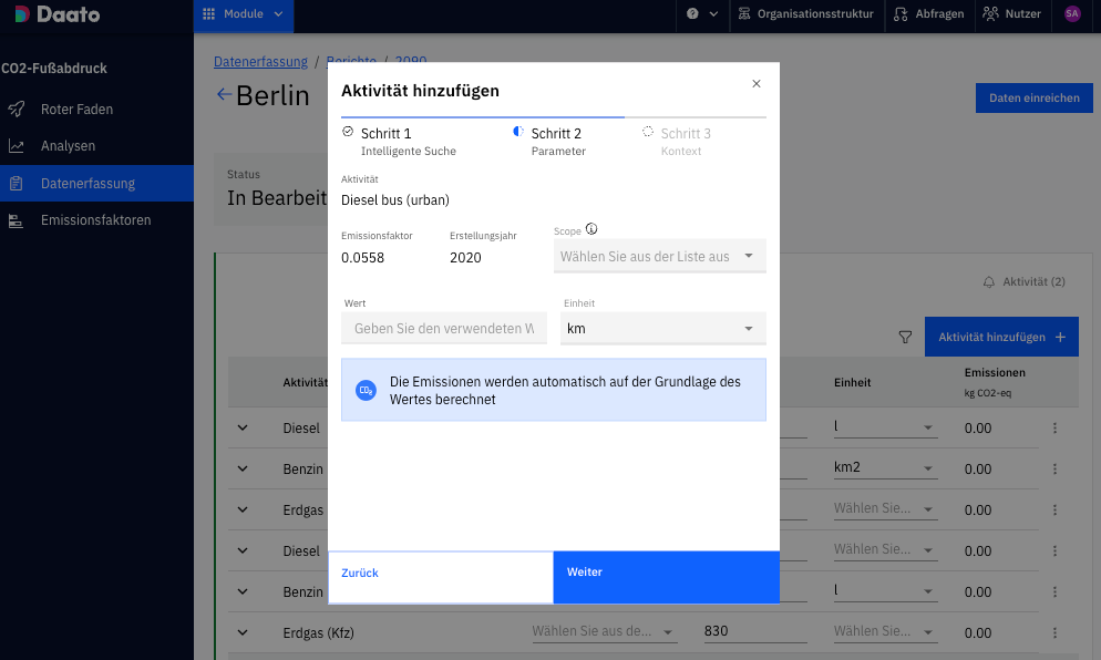 Per calcolare le emissioni di CO₂ delle vostre attività aziendali, voi o i responsabili delle singole entità dovete inserire o caricare le attività sulla nostra piattaforma. Daato moltiplica automaticamente questi dati per i fattori di emissione, calcolando così le emissioni associate a ciascuna attività.
