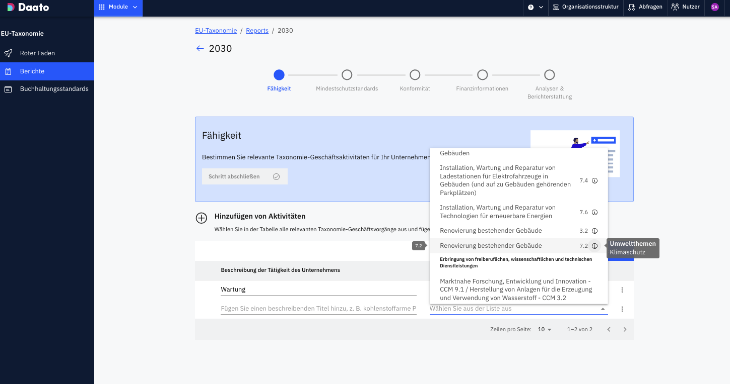 Daato presenta la lista delle attività tassonomiche nell’interfaccia: basta selezionare quelle applicabili alla vostra azienda.