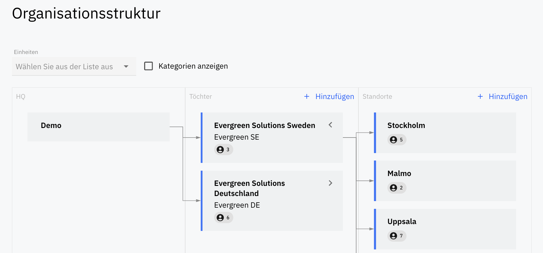 Immagina che la tua azienda debba fornire molti KPI ambientali e molti KPI sociali. Supponiamo che la tua azienda abbia più filiali e che ciascuna filiale abbia più sedi. La tua struttura organizzativa in Daato appare così: