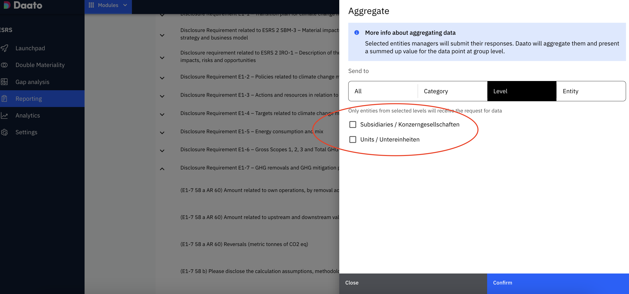 Se invece non hai ancora raccolto dati ambientali, userai Daato per raccogliere per la prima volta molti KPI ambientali dall’intera organizzazione, e quindi dovrai ottenere dati (consumo di energia, acqua, ecc.) non solo dalle filiali ma anche dalle sedi, in modo che tutti i contributi vengano aggregati in un totale a livello di gruppo. Per tutti i punti dati relativi scegli “Aggregata” e selezioni Unità / Sedi: