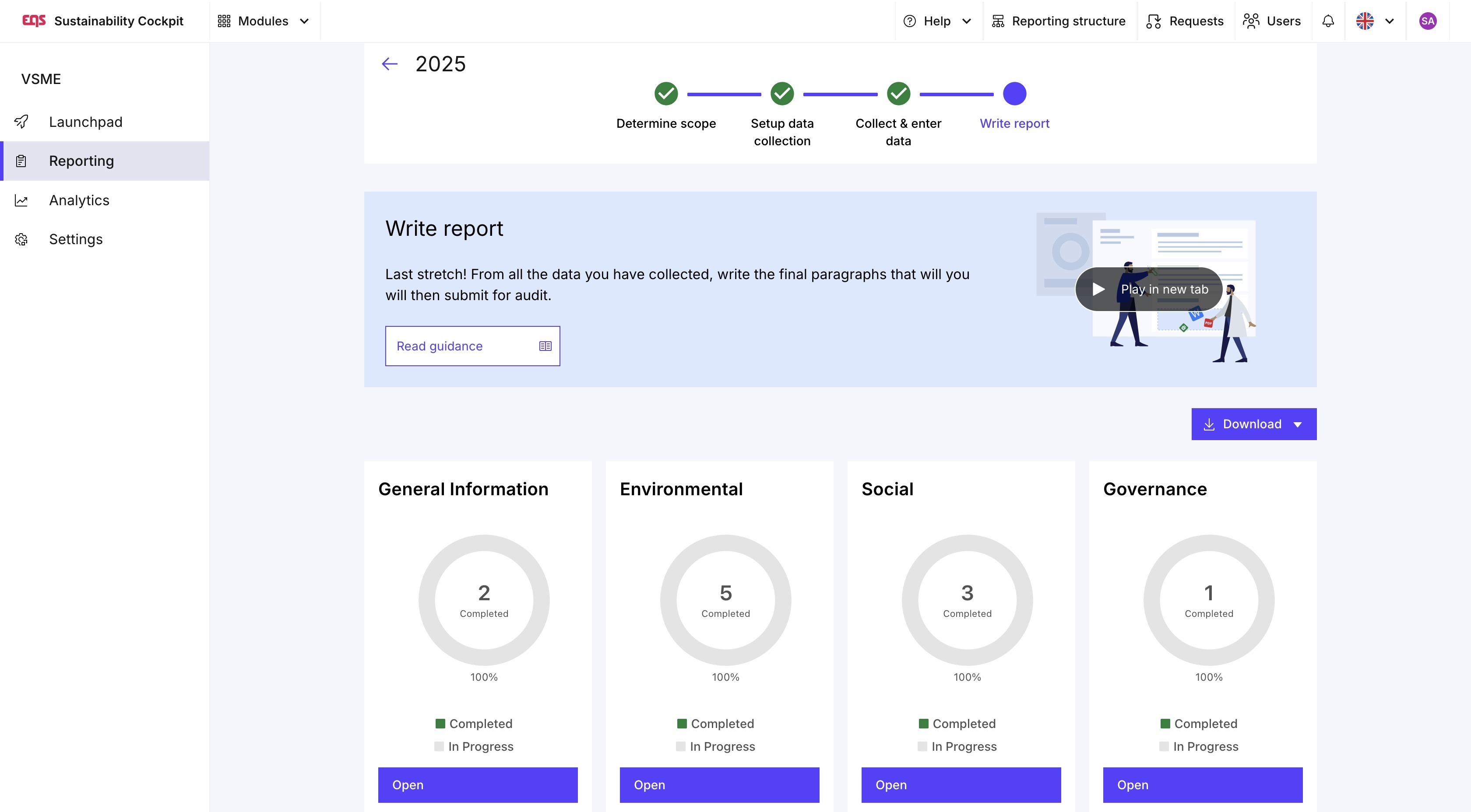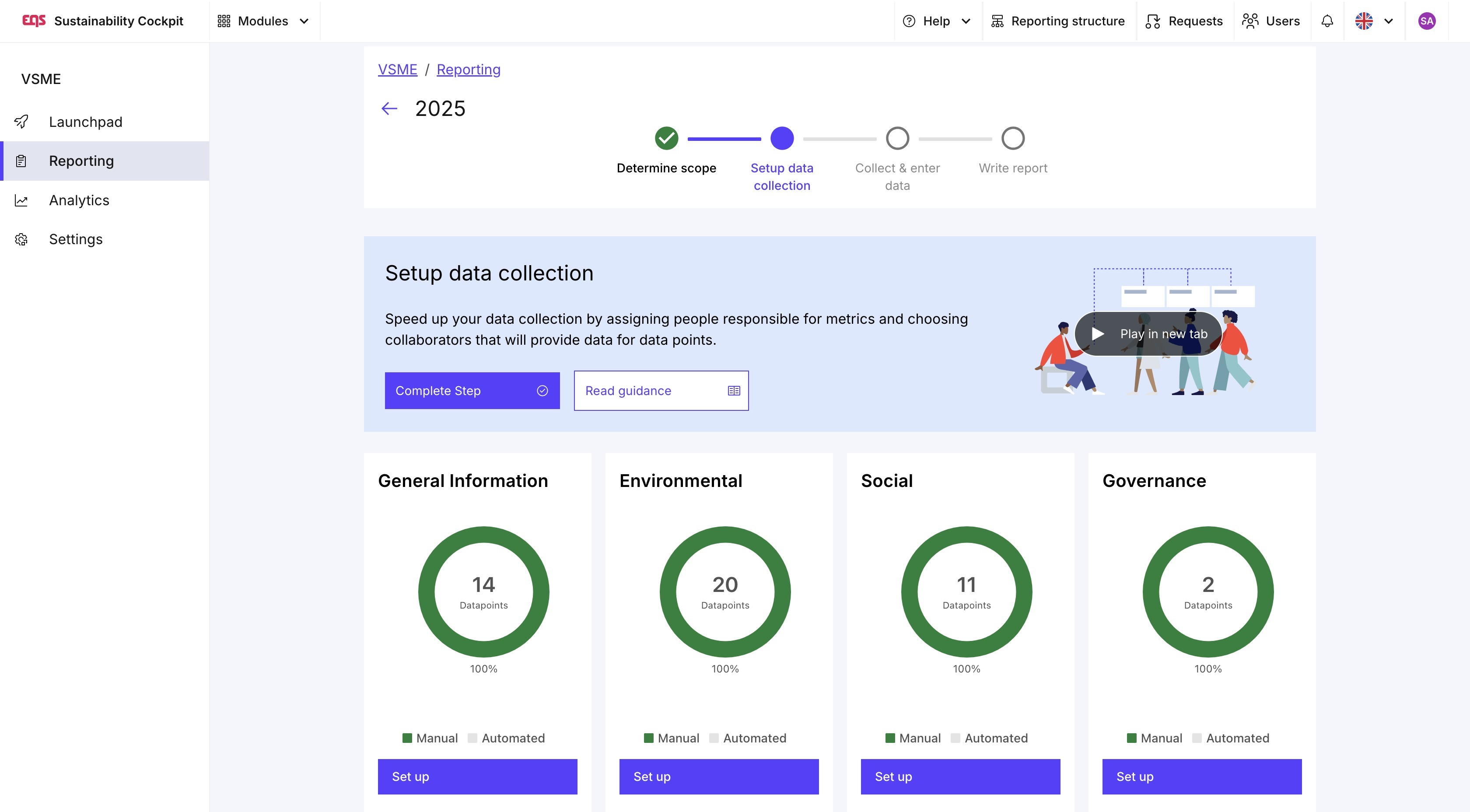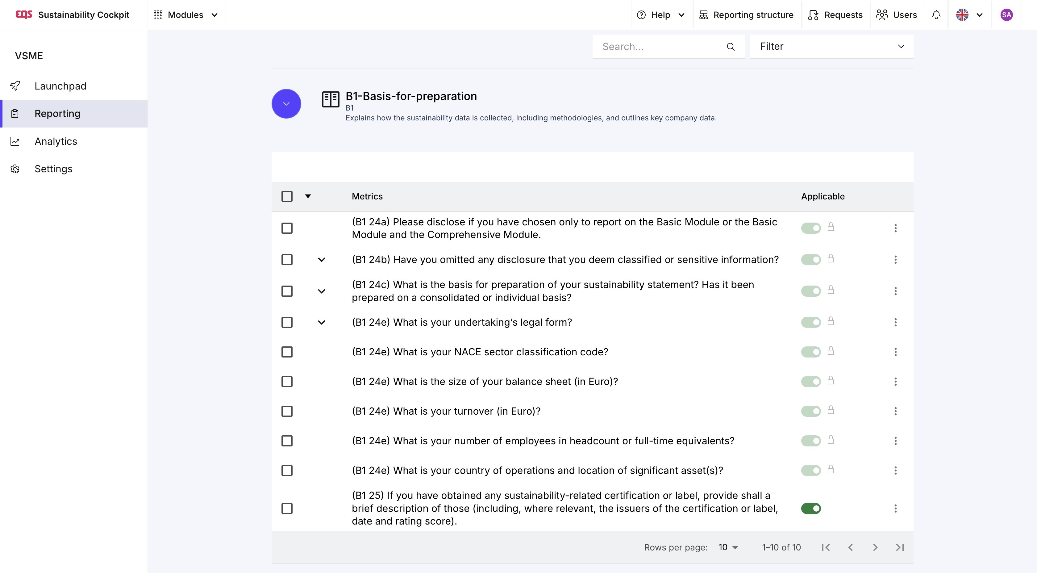 Nel modulo VSME, vi guideremo attraverso i vari passaggi del vostro report di sostenibilità con l'aiuto del nostro launchpad. Nel resto di questo articolo, vi presenteremo questi passaggi. Qui potete anche vedere come il modulo VSME è strutturato all'interno dell'EQS Sustainability Cockpit: