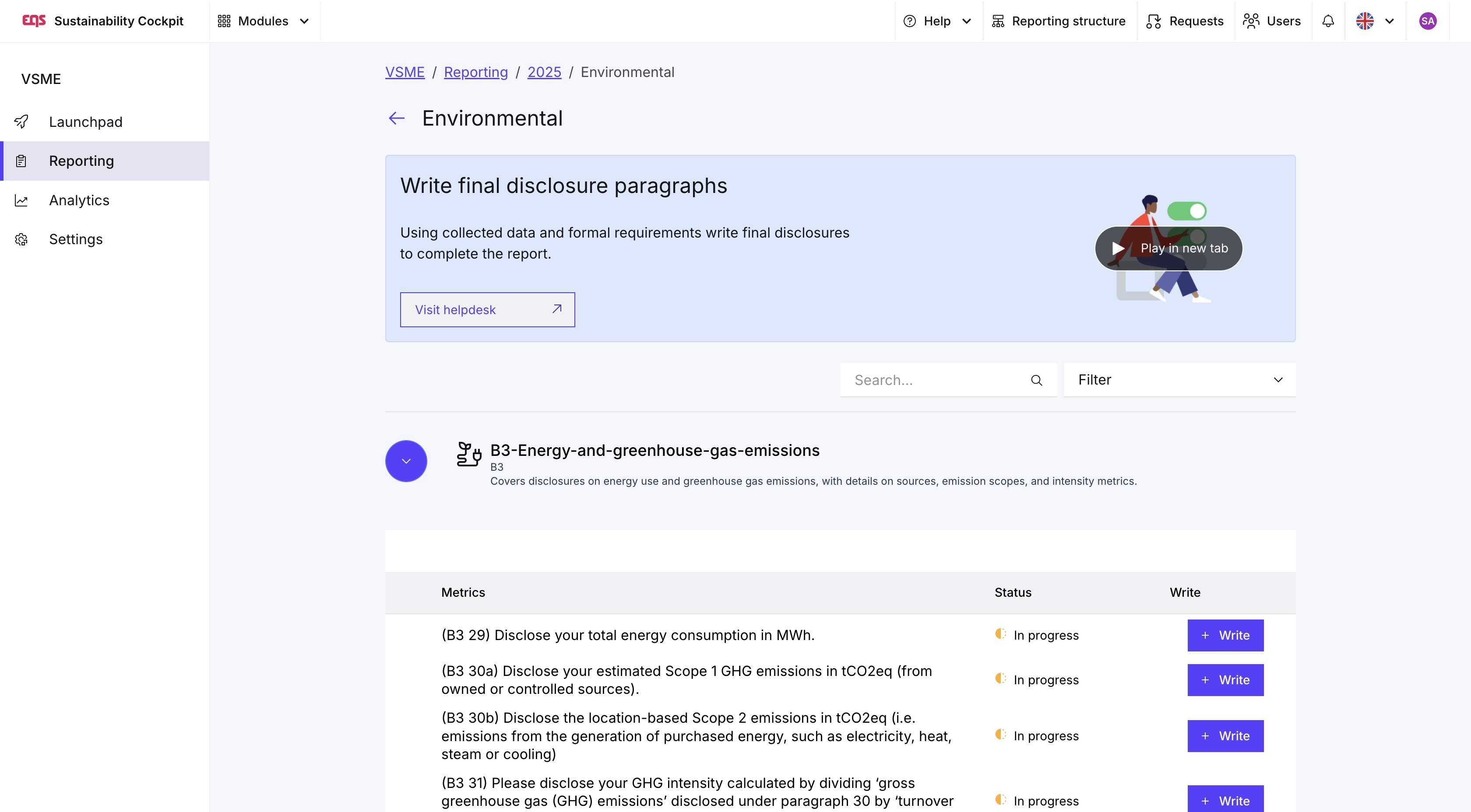 Ora visualizzerai una tabella con tutti i requisiti di informativa, dove potrai creare i rispettivi paragrafi del report. Per assisterti, l'EQS Sustainability Cockpit fornisce indicazioni, checklist e supporto basato sull'intelligenza artificiale per generare bozze di sezioni del report.