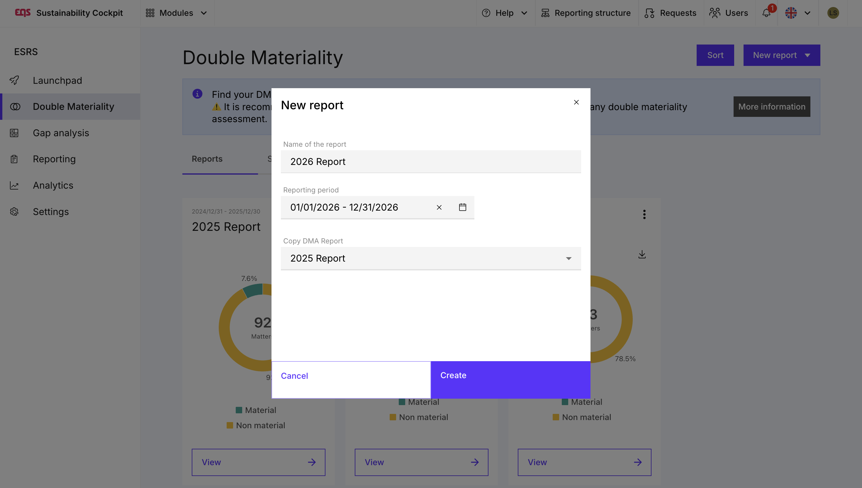 Una volta creato, verrà generato un nuovo report di doppia materialità basato sul report di origine selezionato.
